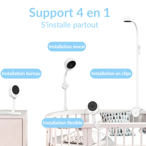 Le Purebebe FlexiView™ s’adapte à toutes les situations grâce à son support 4 en 1. Que vous préfériez le fixer au mur, le poser sur un bureau ou l’attacher au berceau, sa conception flexible garantit toujours le meilleur angle de vue sur votre bébé.